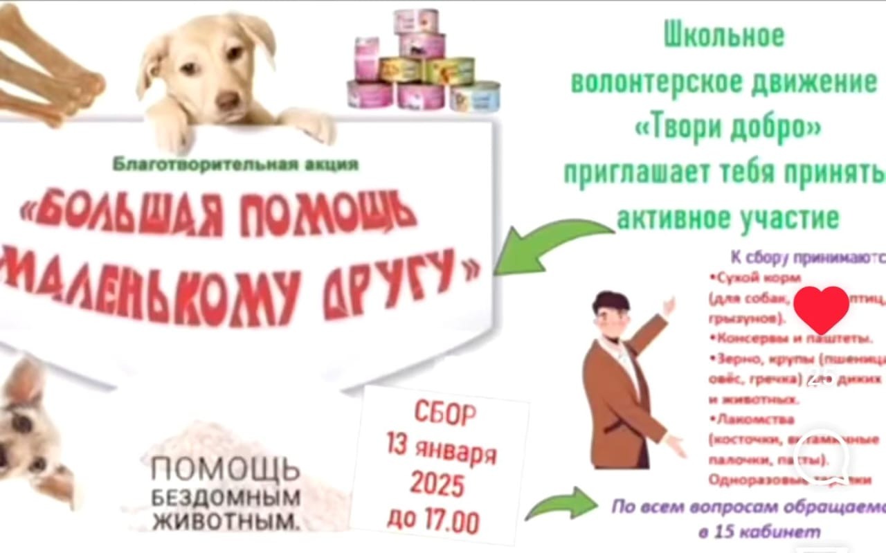 Біздің мектебімізде жыл сайын мектеп парламенттімен және еріктілер «Кішкентай досқа үлкен көмек!» атты қайырымдылық акциясын өткізеді! Оқушылар, мұғалімдер және ата-аналар бірігіп, әлемді мейірімді етуге және баспанасыз жануарларды қолдауға атсалысады.
