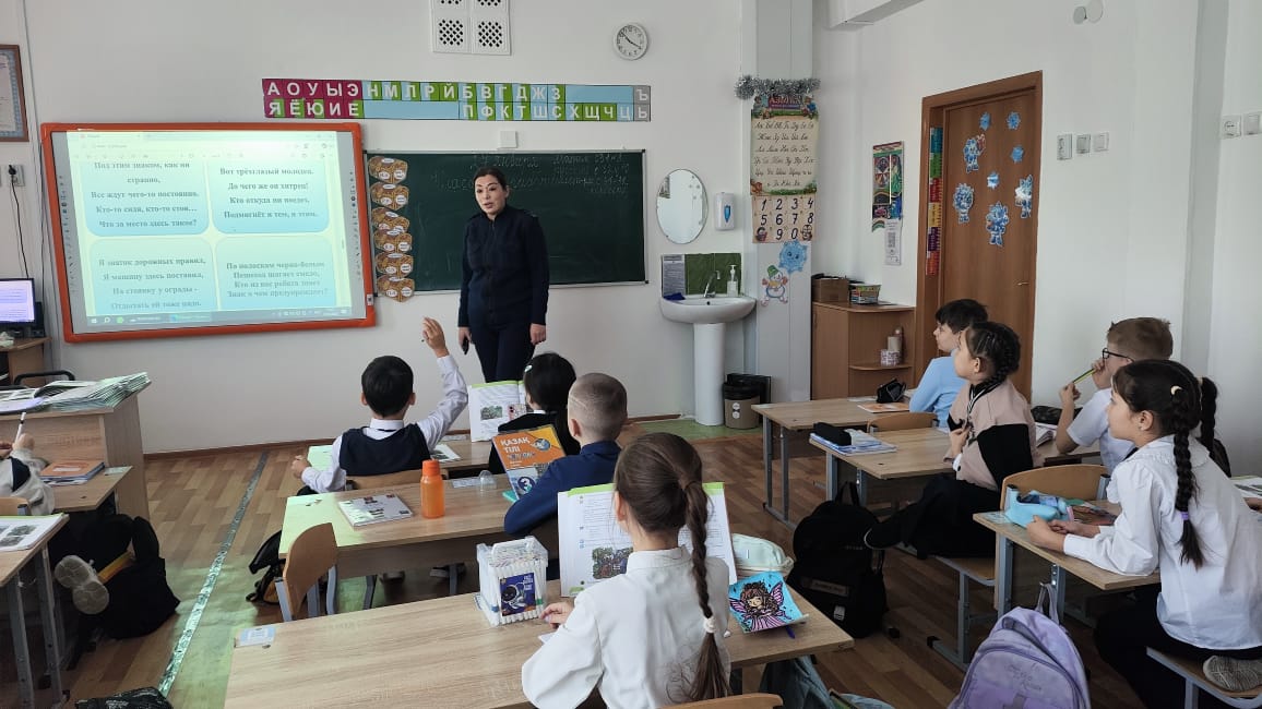 27.01.2026 күні мектеп инспекторы Дулатова А.К. 2-сынып оқушыларына арналған «Жол қозғалысы ережелері» тақырыбында станциялар бойынша интерактивті ойын өткізді. Ойын барысында оқушылар жол белгілерін, жаяу жүргіншілердің жолдағы жүріс-тұрыс ережелерін қайталап, түрлі жол жағдайларын талқылады. Іс-шара белсенді әрі қызықты өтті, жол қозғалысы ережелері бойынша білімдерін бекітіп, жолдағы қауіпсіз мінез-құлықтың маңызын еске салды.