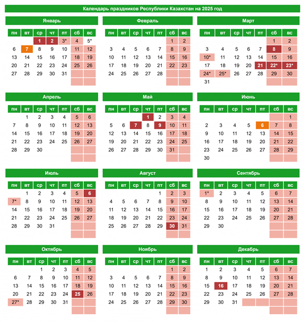 Наурыз мейрамы (с субботы и воскресенья 22, 23 марта переносится на понедельник и вторник 24, 25 марта) |